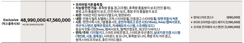 - 인포테인먼트 : BOSE 프리미엄 사운드(14 스피커, 외장앰프), 액티브 로드 노이즈 컨트롤