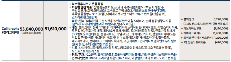 - 외관 : 캘리그래피 전용 그릴 & 전용 19인치 알로이 휠 & 타이어,
