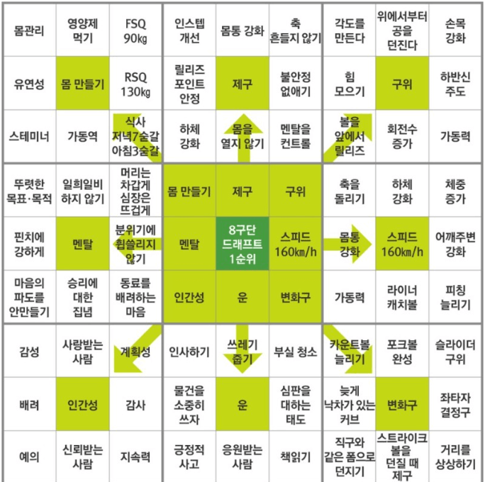 아래 오타니의 만다라트 양식을 참고해 보시고 본인에게 어울리는 만다라트 양식을 하나씩 작성해서 목표를 이루시기 바랍니다.