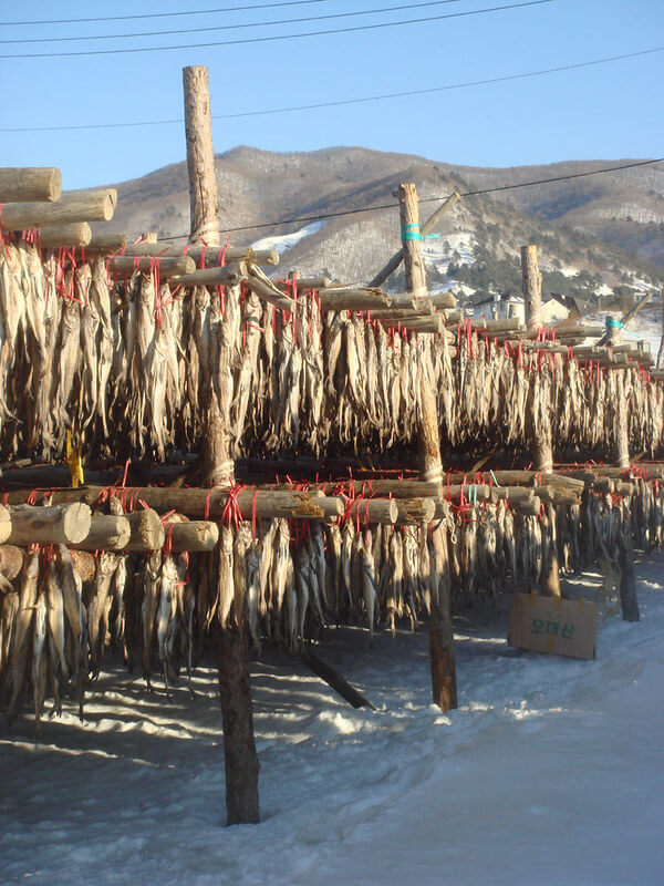 "황태"는 추운 환경에서 자연적으로 말려 노랗게 변한 명태를 가리키는데, 이는 명태가 특정한 기후 조건에서 오랜 기간 동안 말려서 건조되면서 발생하는 현상입니다.