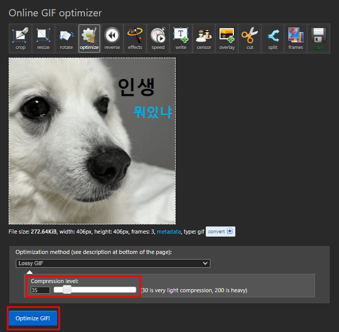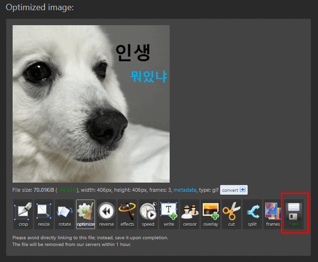아래 생성된 GIF에서 optimize(최적화하기) 라는 버튼을 누르면 이미지를 압축할 수 있습니다. GIF 이미지가 용량이 크다 보니 꼭 최적화 작업을 한번 해 주셔야 사용에 편리합니다.