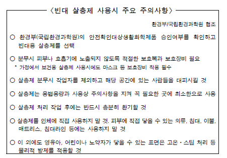 - 빈대 제고 살충제를 사용하여 빈대들을 모조리 박멸하여야 합니다. 살충제는 빈대에 직접적으로 뿌리는 것이 우선이며, 빈대가 서식했던 가구 및 벅과 벽 사이에도 분사하여 방제하여야 합니다.