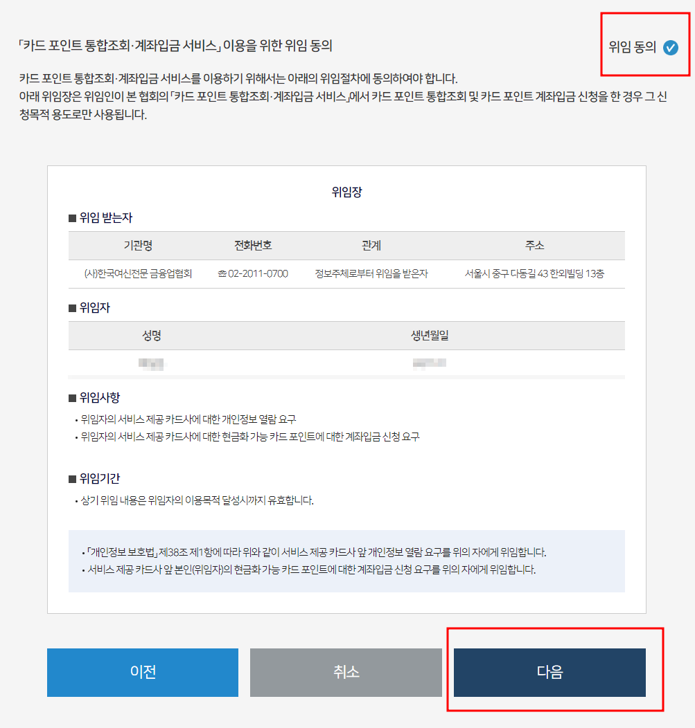 위임동의를 ✔ 체크 하여 카드 포인트 통합 조회 서비스를 한국 여신전문 금융업협회에서 조회 할 수 있게 위임해줍니다.