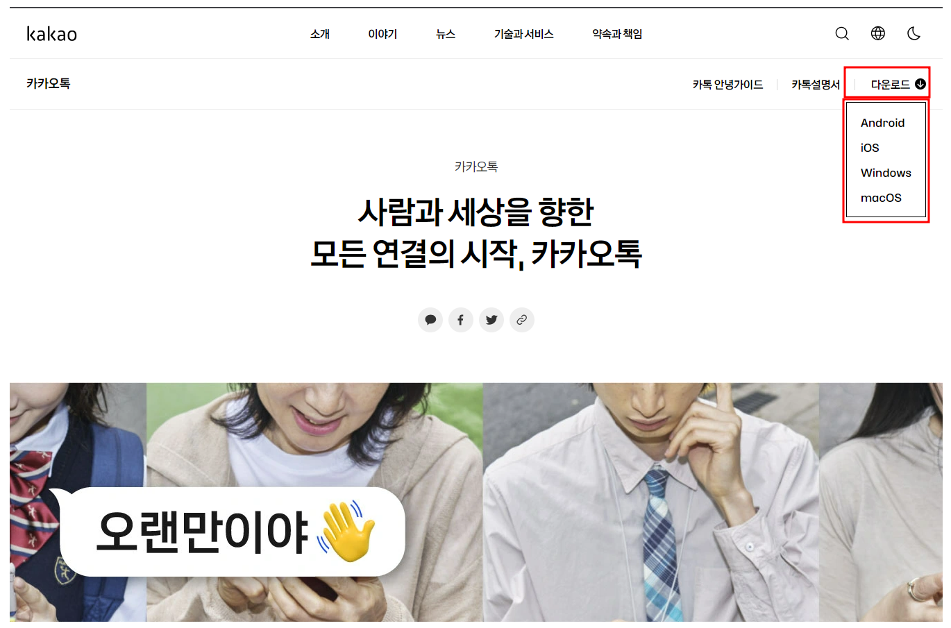 카카오톡 PC버전은 홈페이지를 방문하셔서 아래 페이지의 오른쪽 화면 다운로드를 누르시면 원하는 양식의 프로그램을 다운 받을 수 있습니다.