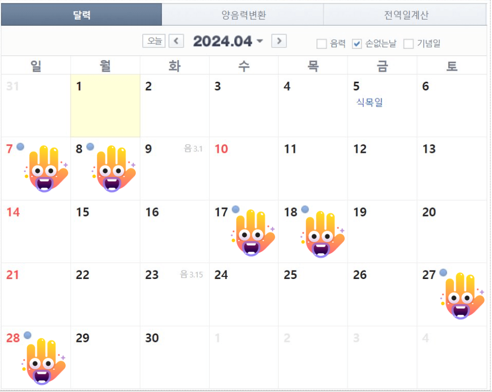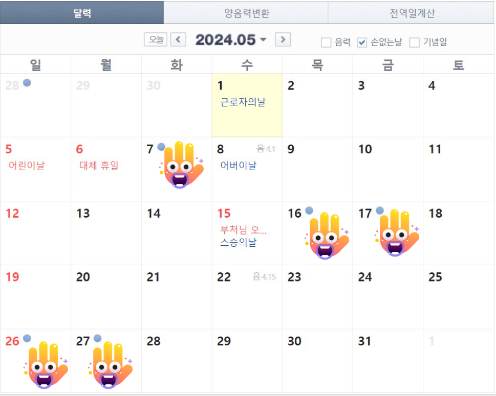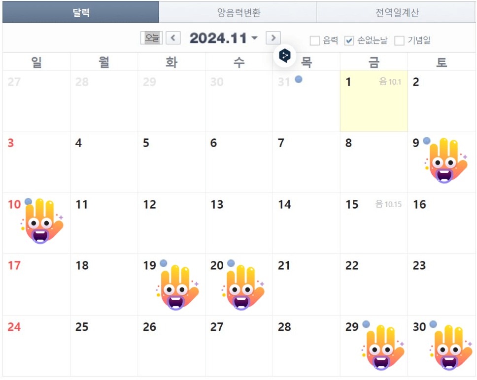 반면에 손 있는 날은 안 좋은 날이라고 합니다. 하지만 31일과 손 없는 날을 제외하면 대부분이 손 있는 날이기 때문에 크게 신경 쓰지 않으셔도 됩니다.