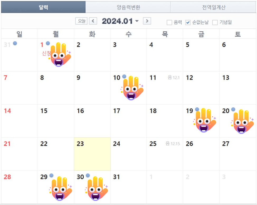 우리가 흔히 손 없는 날을 길일이라고 합니다. 손 없는 날은 특히 길일이기 때문에 이사, 결혼, 개업, 수리등을 하면 좋다고 널리 알려져 왔습니다. 2024년 손 없는 날은 언제 인지 이 글에서 확인 하시고 좋은 날짜에 좋은 행사를 하시기를 기원 합니다.