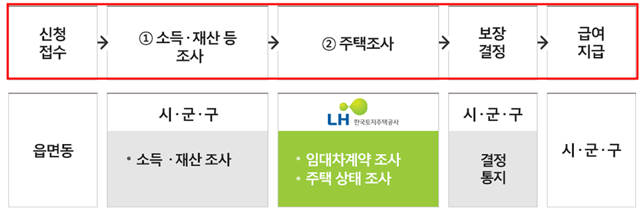 급여 신청시 아래와 같은 진행단계를 거치며 주거급여가 지원됩니다.