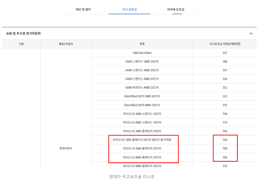현재 국내에서는 현대차의 아이오닉5가 760만원으로 가장많은 국고 보조금을 받고 있습니다.