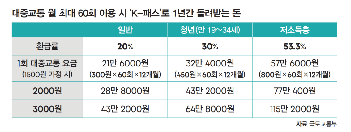 K패스는 전국 지하철, 버스 등 대중교통 이용 횟수에 비례해 요금을 환급해주는 통합권으로서, 월 15회 이상 대중교통을 이용했을때(최대 60회) 요금의 20~53% 적립하여 금액을 환급받을 수 있기 때문에, 대중교통으로 출퇴근 하시는 직장인, 학생 이라면 무조건 신청 하는게 이득인 카드 입니다. 저소득층이라면 월 최대 48,000원까지 환급받을 수 있습니다.